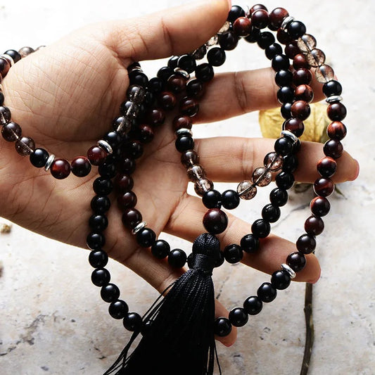Colar Japamala e pulseira Mudra- Ônix, olho de tigre vermelho, cristal quartzo