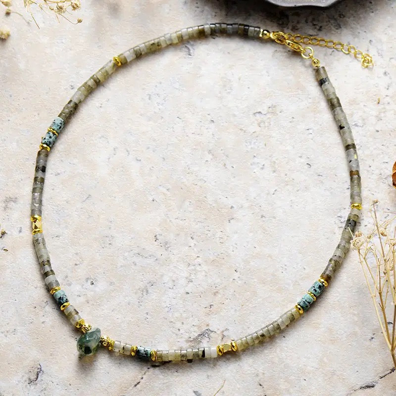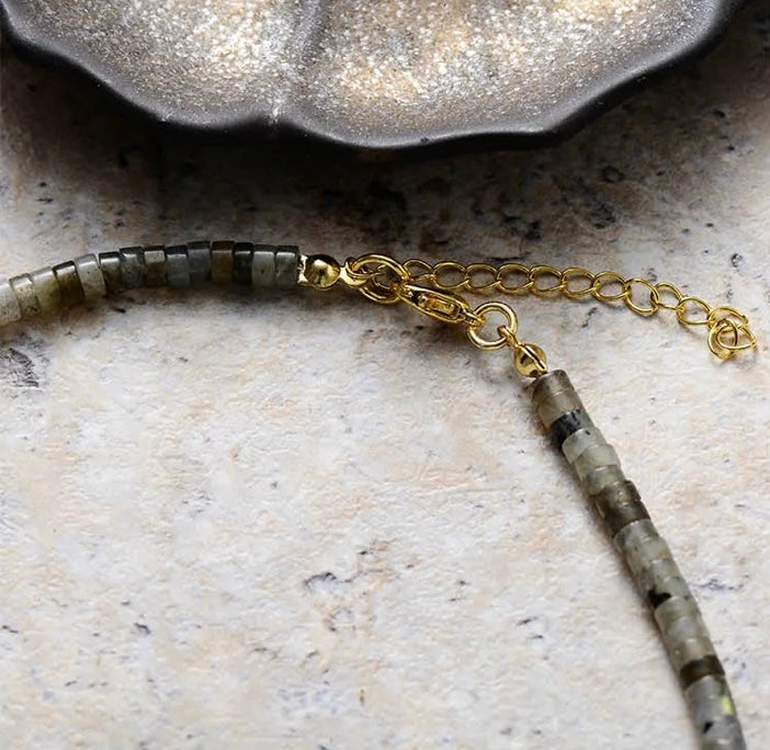 Descubra a magia e o mistério com o colar Aurora, com as deslumbrantes pedras de Labradorita.