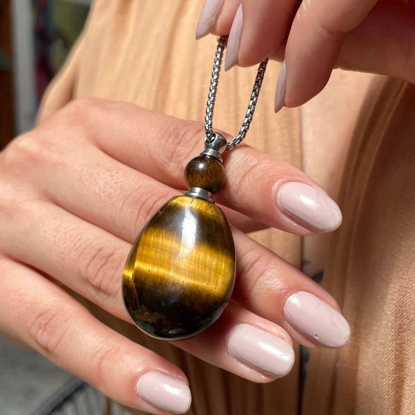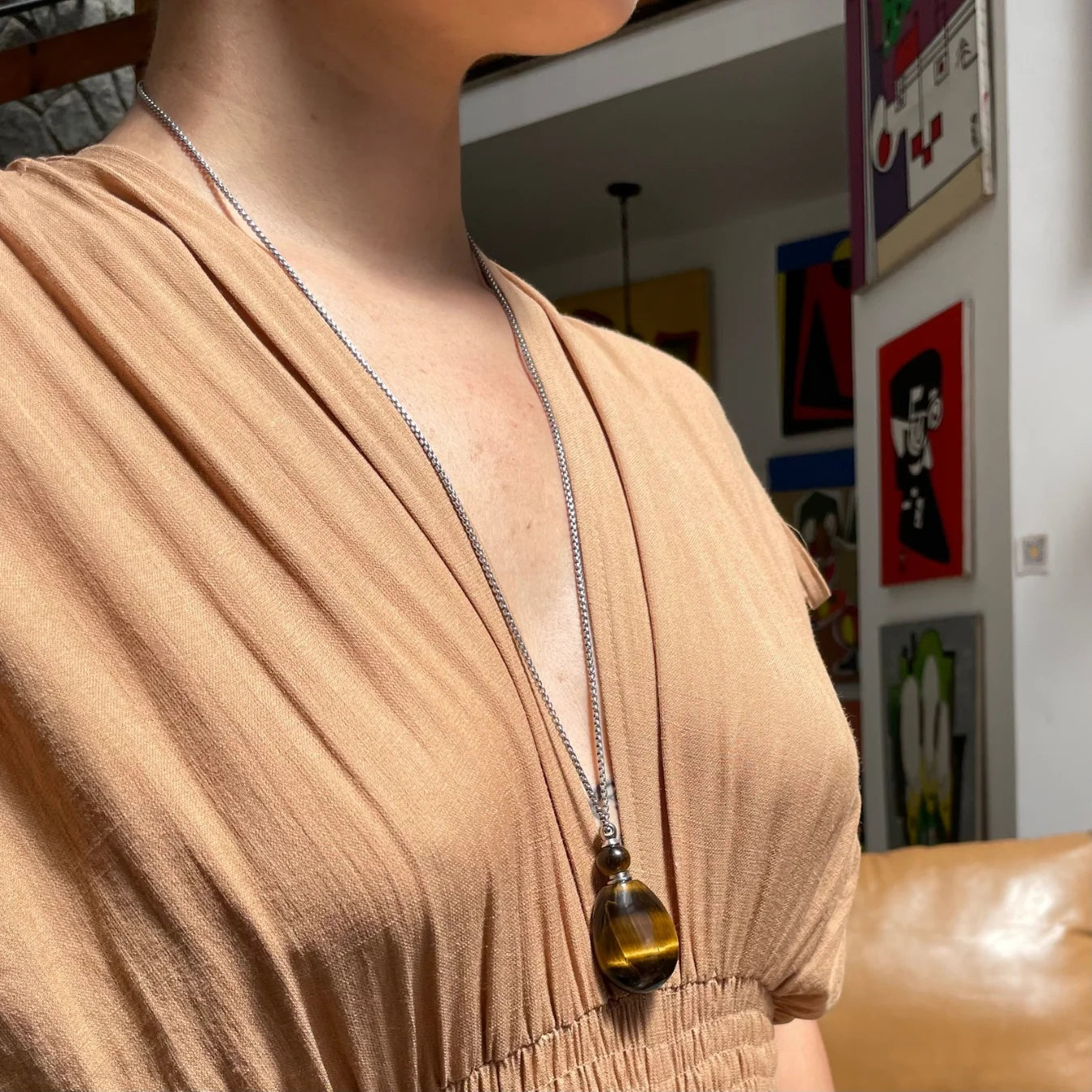 O destaque desse colar encantador é o seu pingente de pedra natural de olho de tigre.