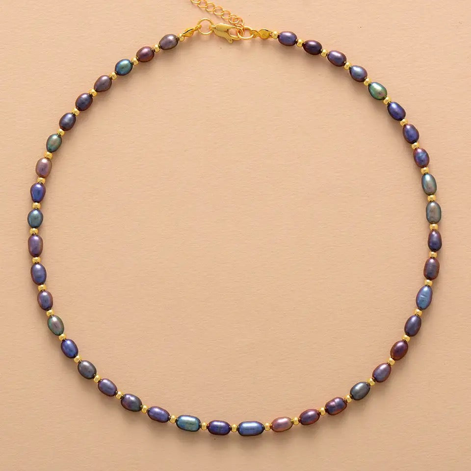 Esse colar é feito manualmente por nossos artesãos, criando uma harmonia entre as diferentes lapidações, cores e texturas das pérolas.