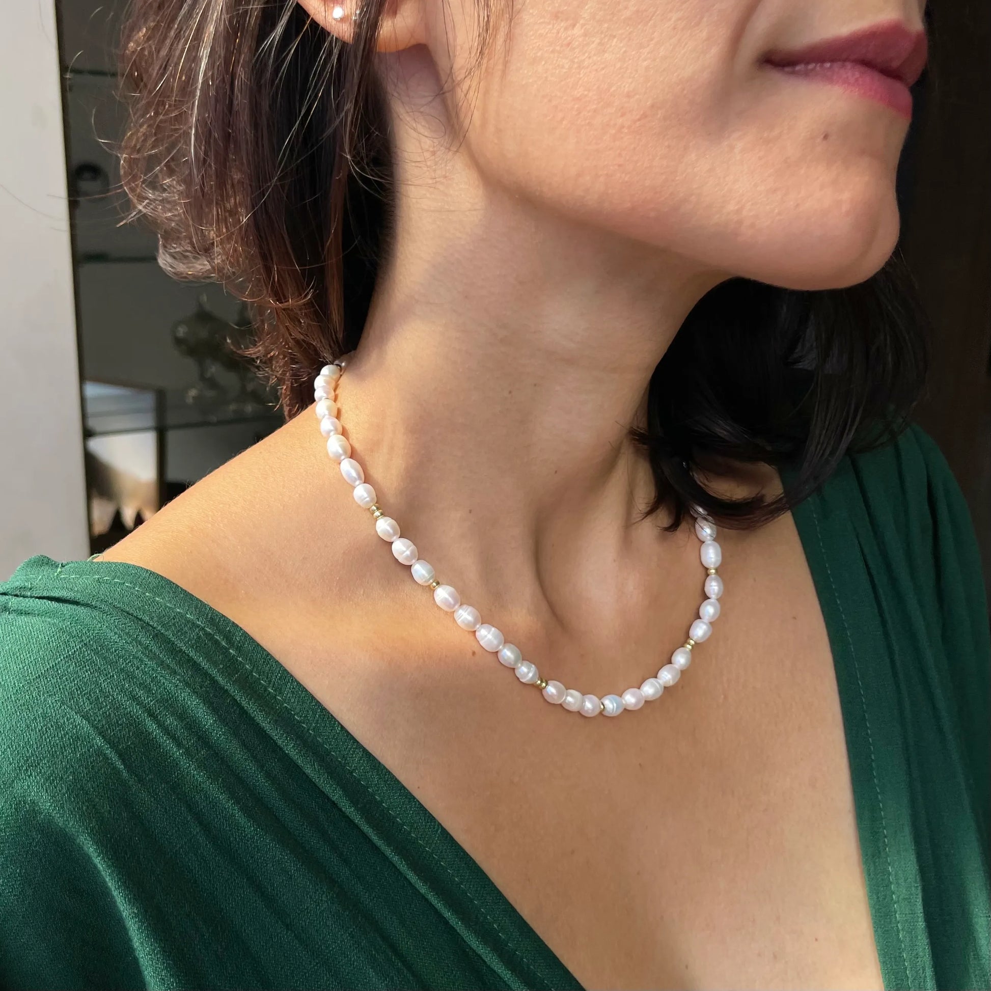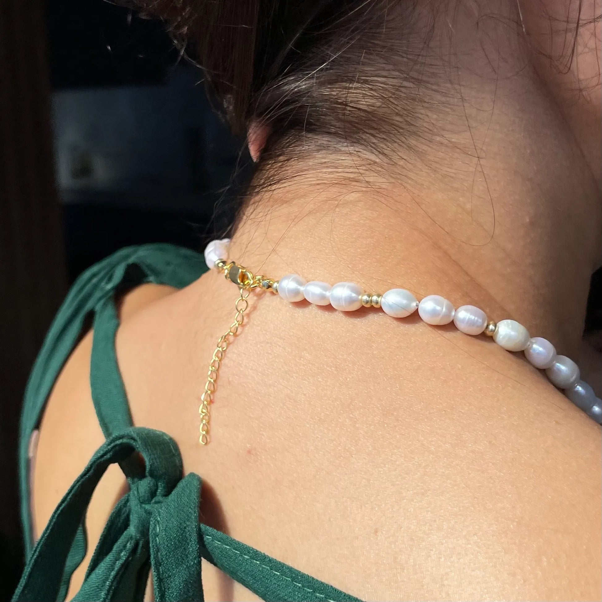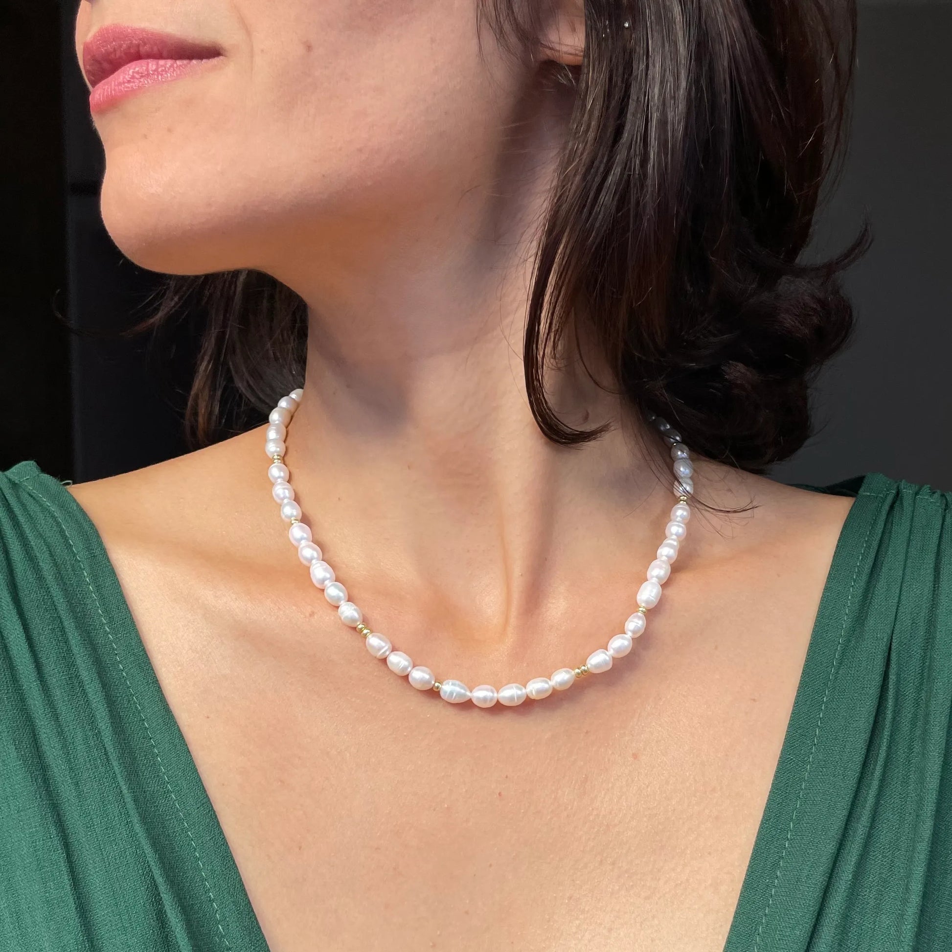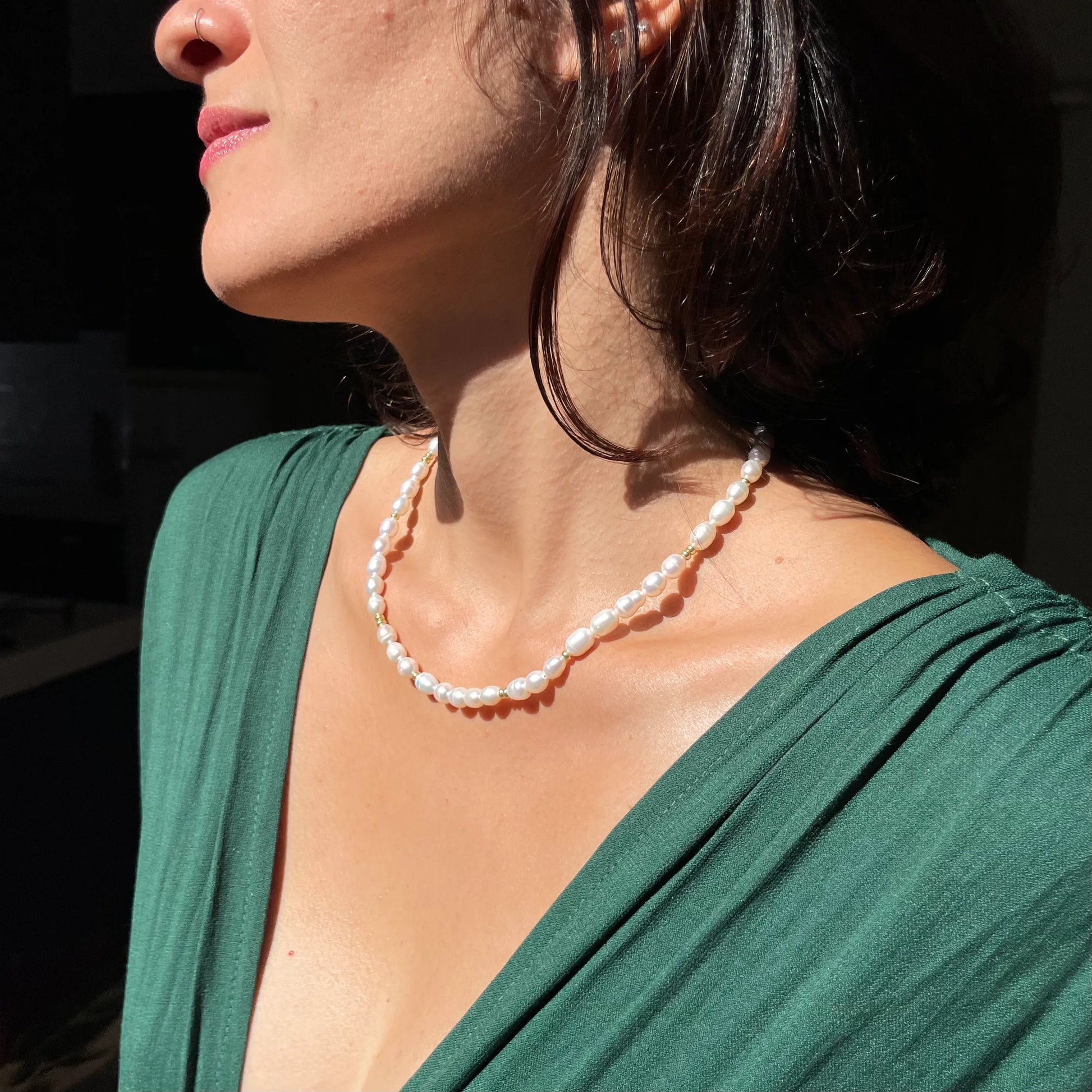 Esse colar é feito manualmente por nossos artesãos, criando uma harmonia entre as diferentes lapidações, cores e texturas das pérolas.