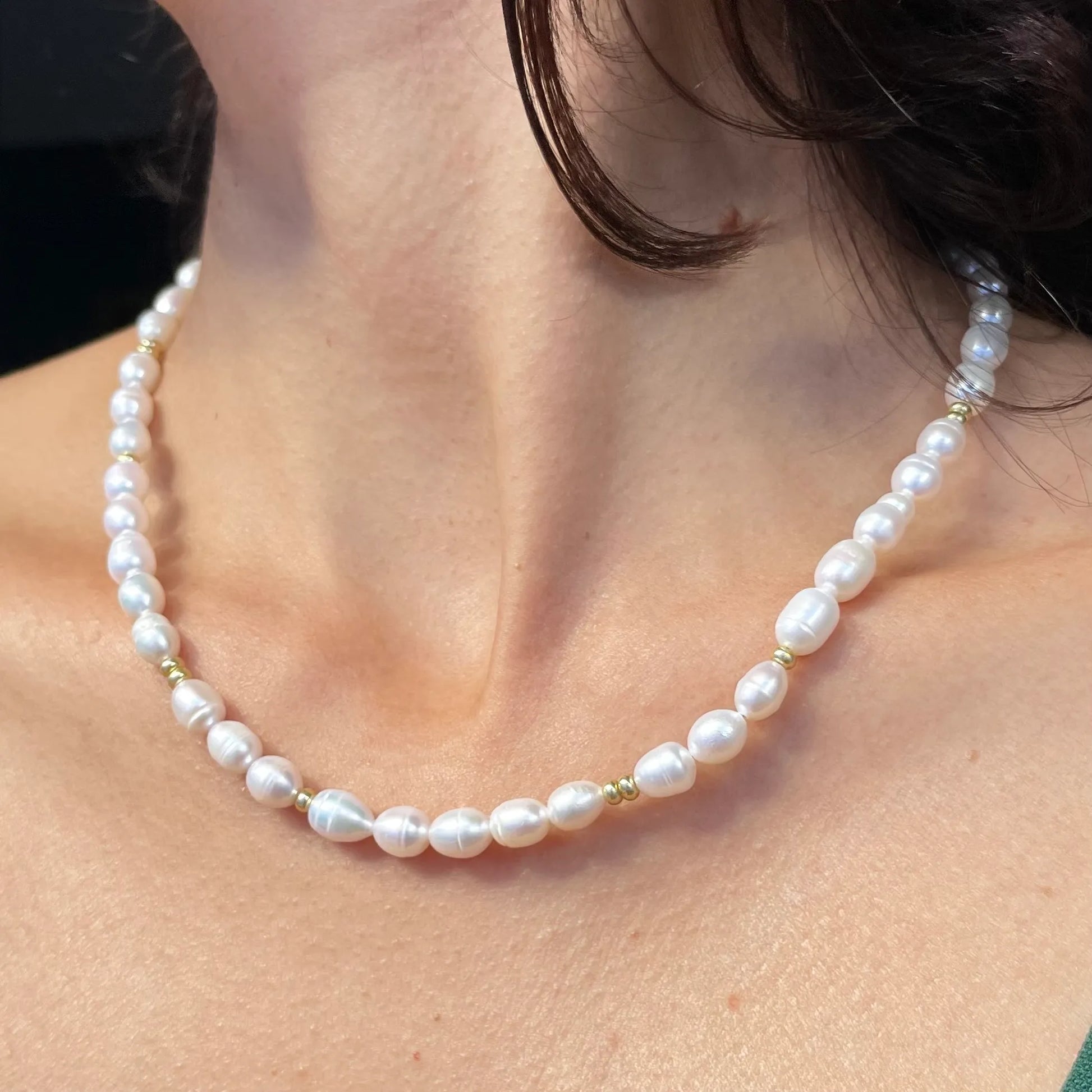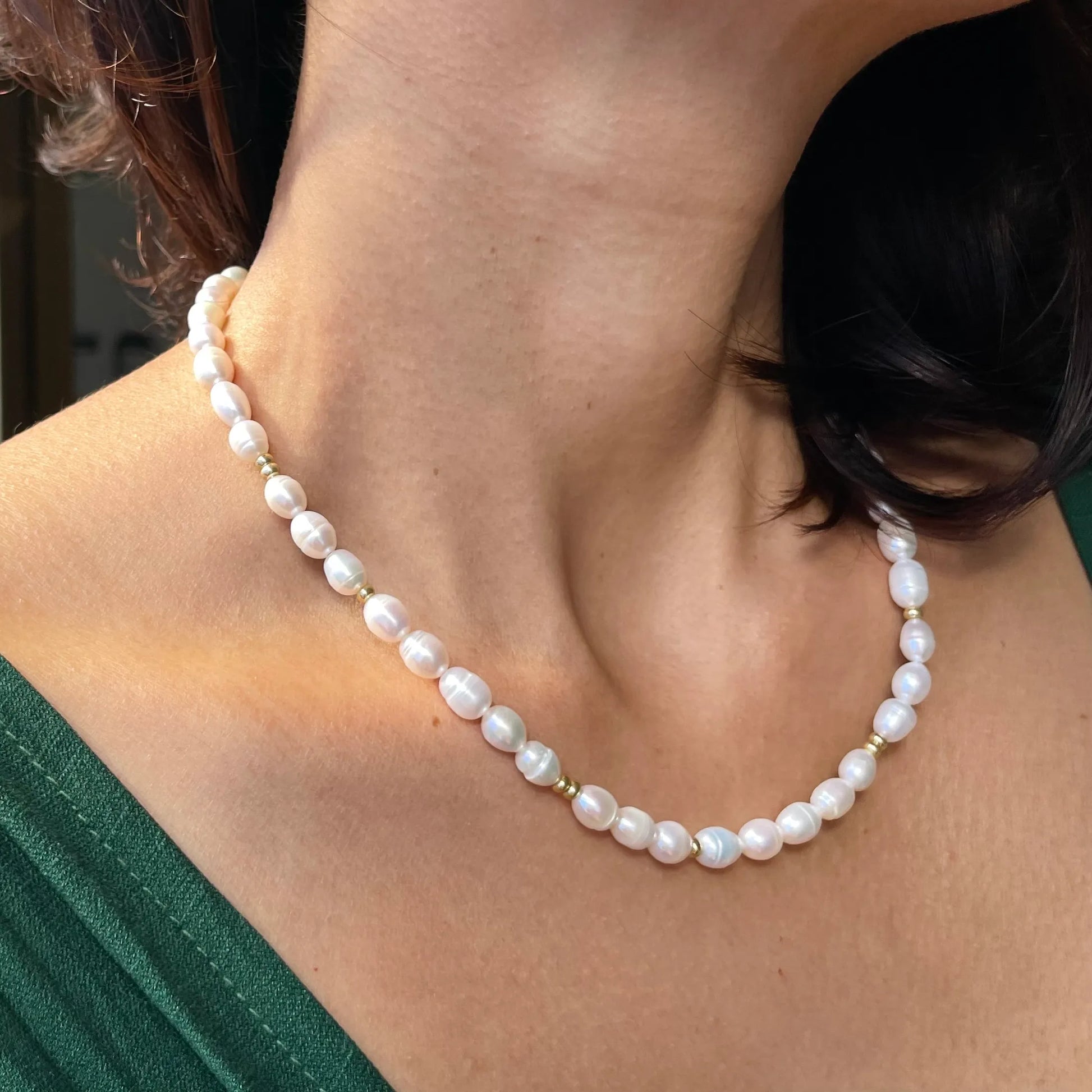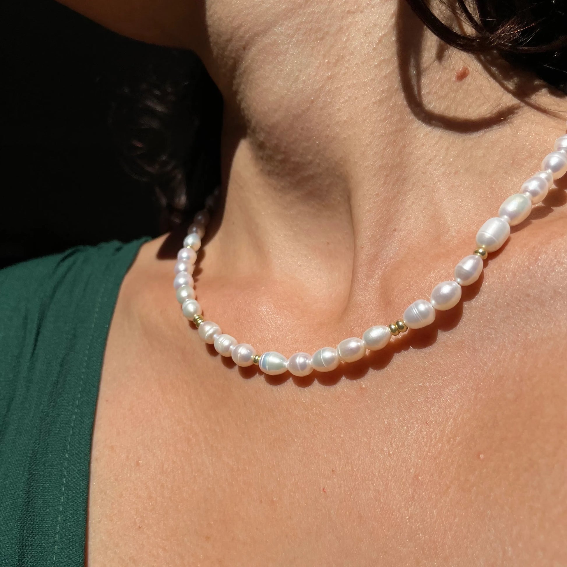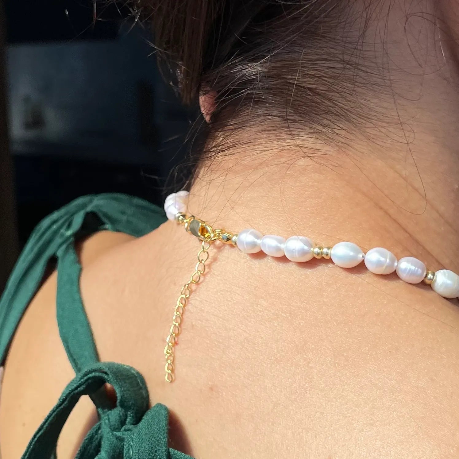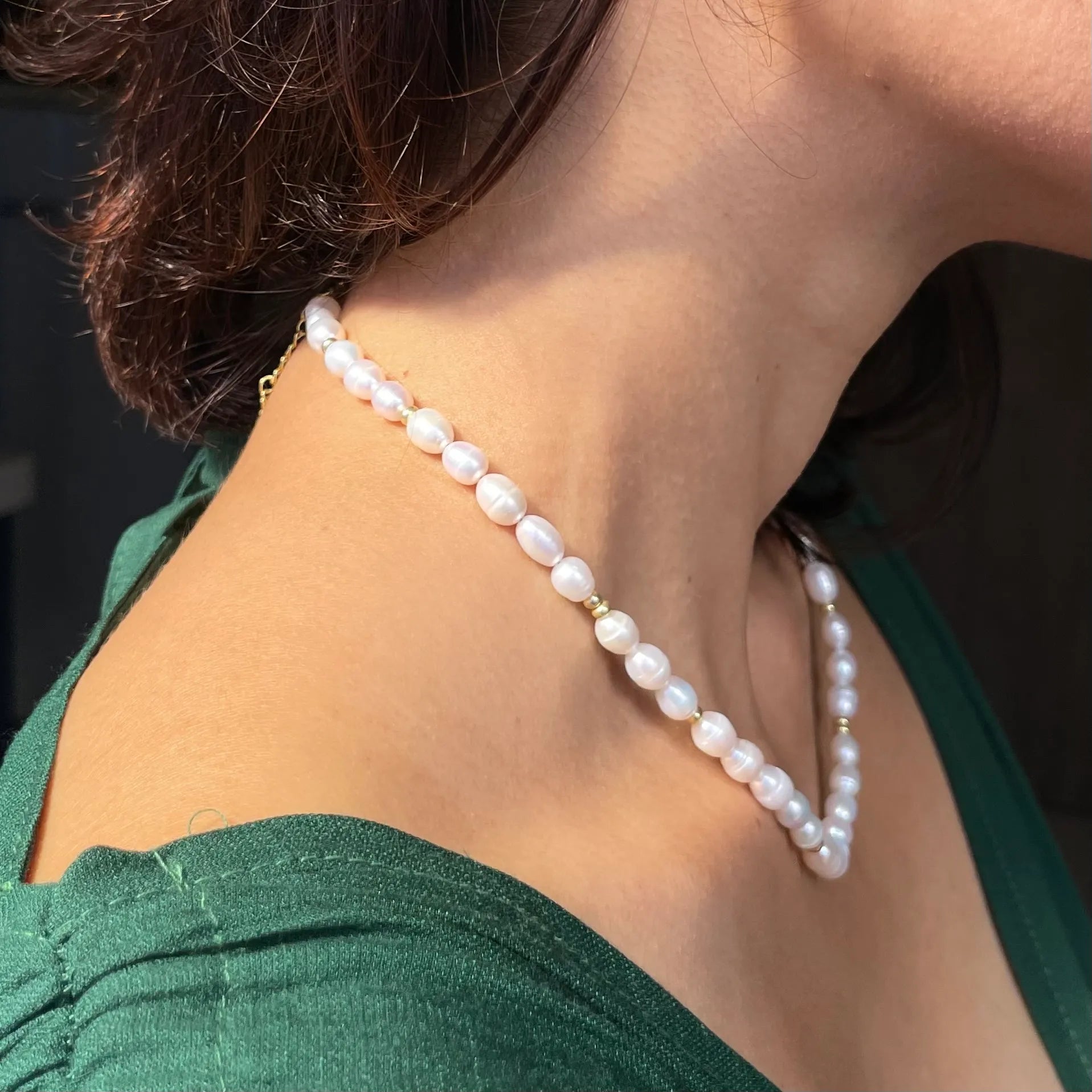 Esse colar é feito manualmente por nossos artesãos, criando uma harmonia entre as diferentes lapidações, cores e texturas das pérolas.