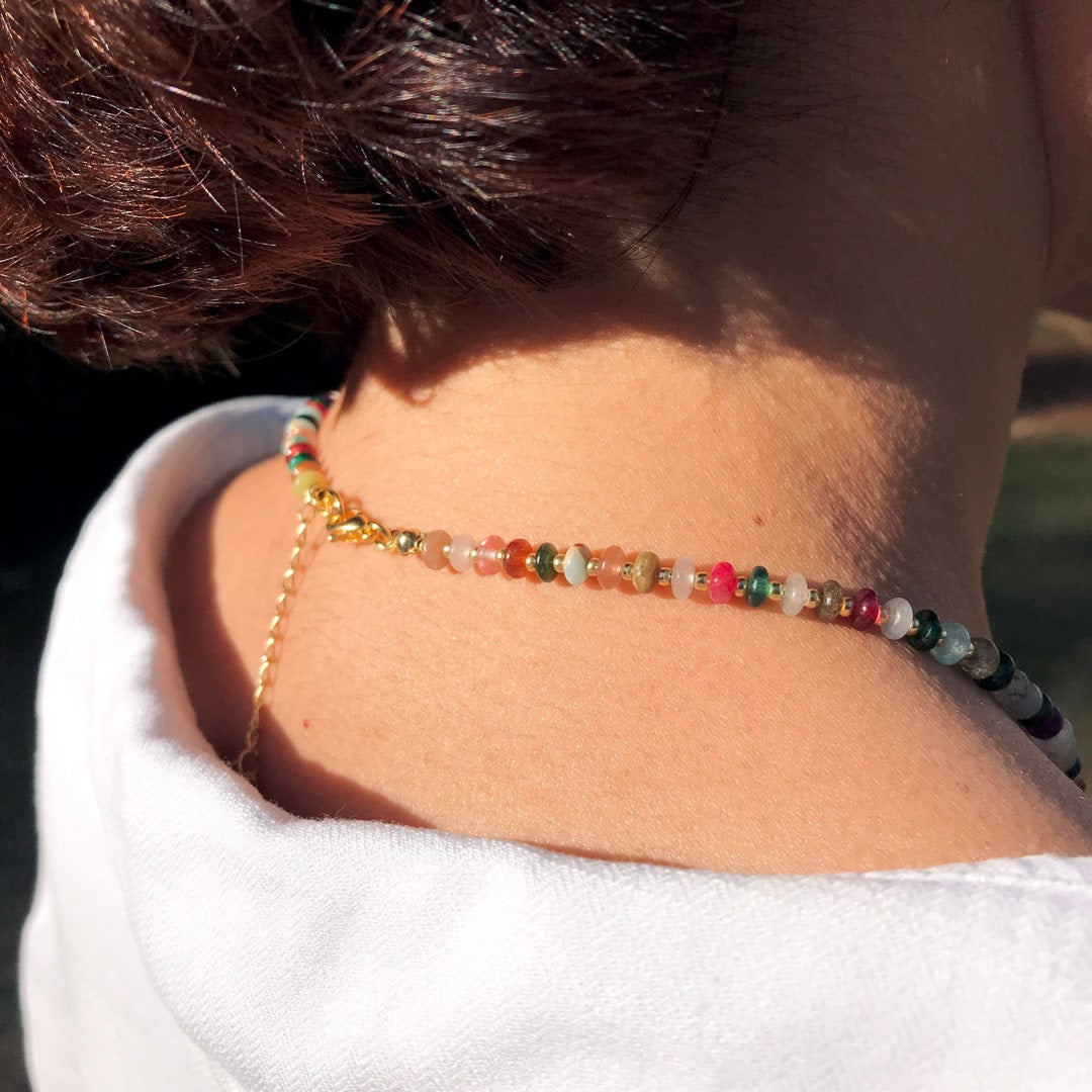 Cada uma dessas pedras tem seus próprios significados e propriedades energéticas, trazendo positividade e vibrações tropicais para quem as usa. O colar é discreto e versátil, sendo uma ótima escolha para usar em qualquer ocasião, além de ser um presente perfeito para mulheres especiais em sua vida.