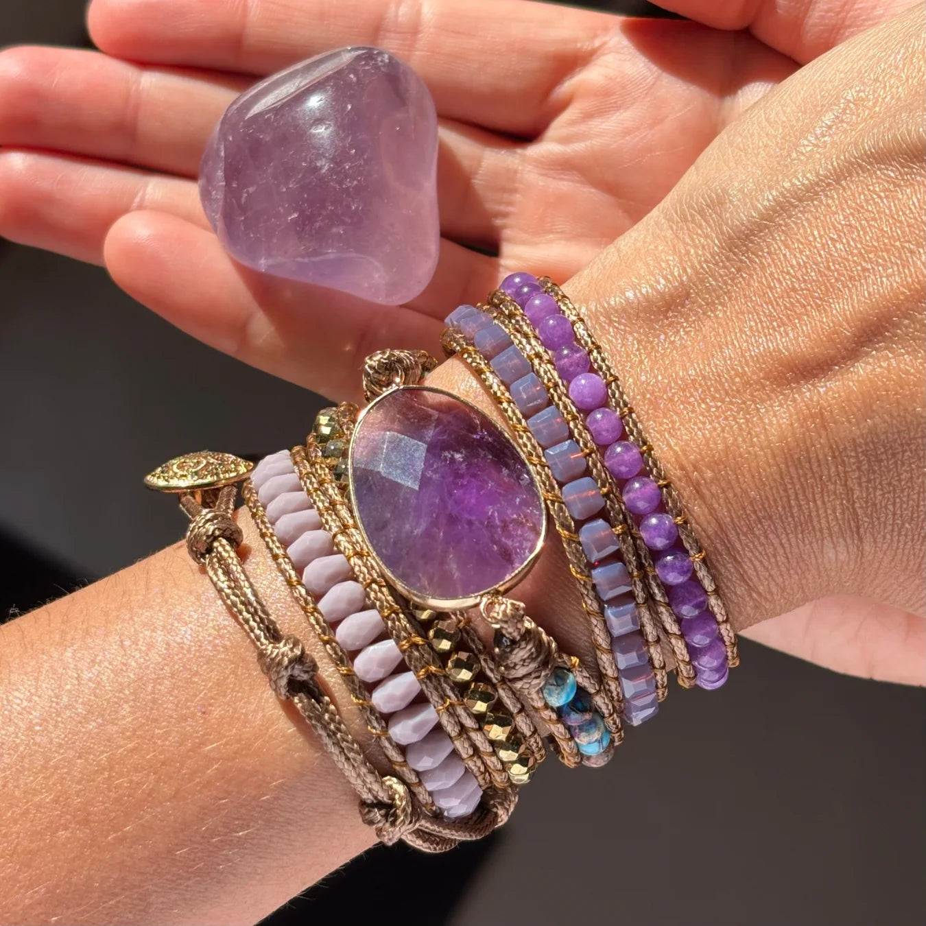 - Pedras naturais: Ametista e Hematita.