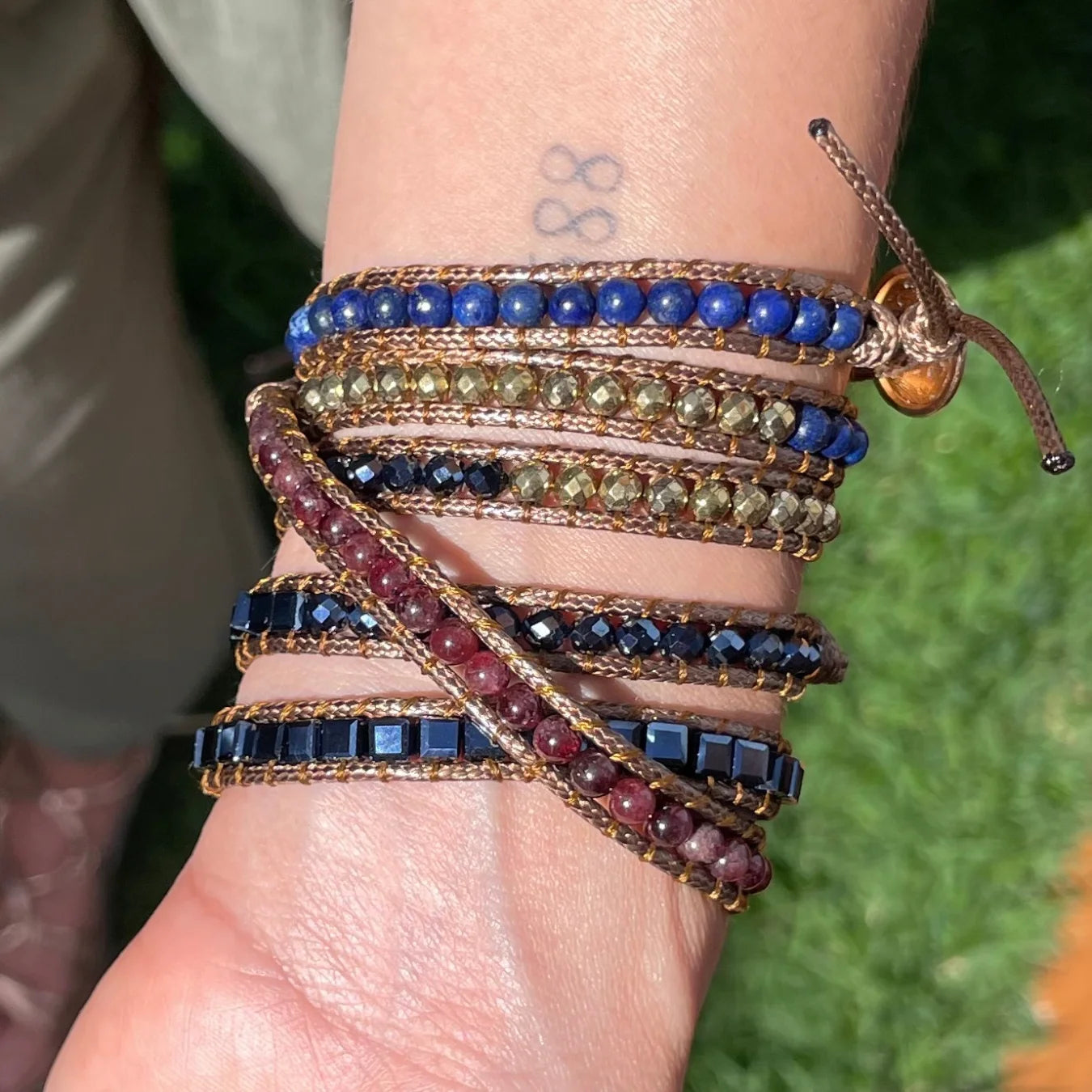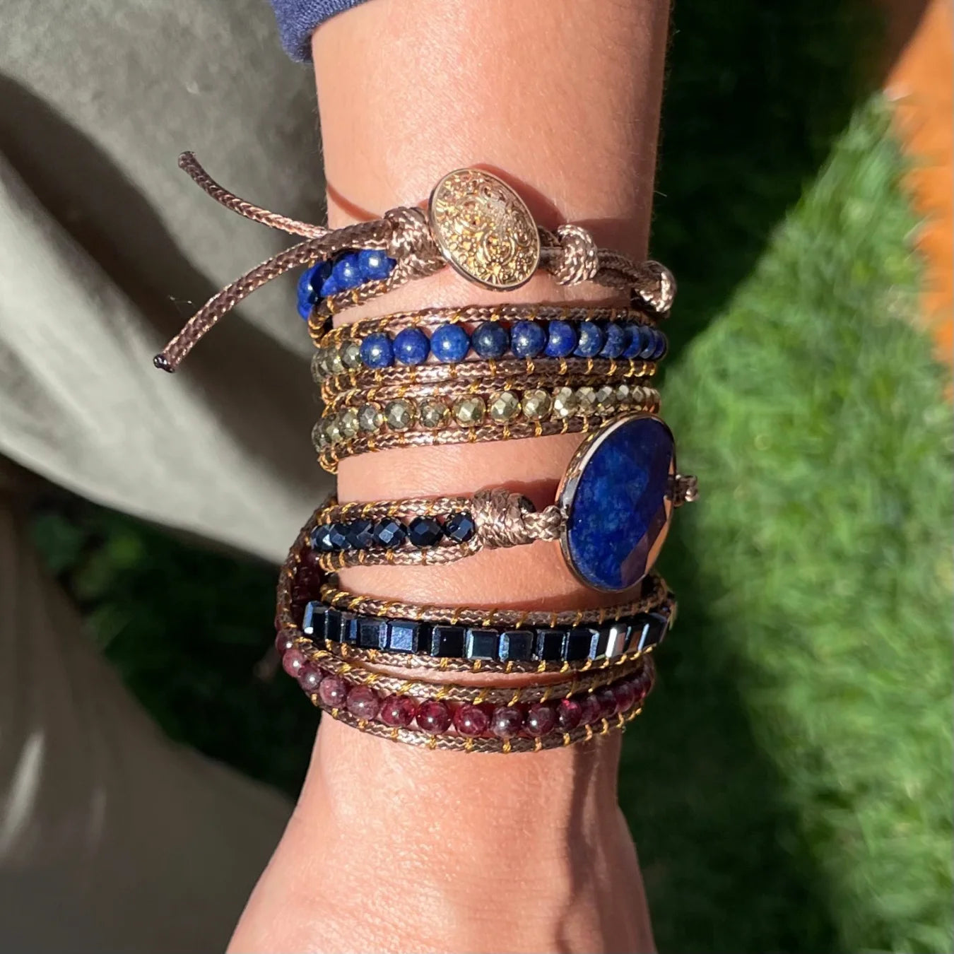 Ela é feita a partir da combinação de 3 pedras naturais muito especiais: Lápis Lazuli, Hematita e Granada.