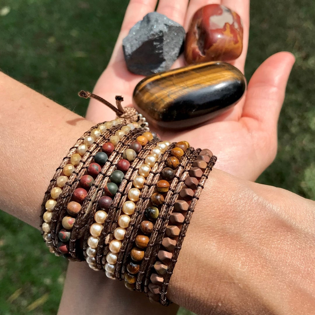 Para deixar essa peça autêntica e cheia de energia, foram usados três pedras naturais: Olho de Tigre, Jaspe Picasso e Hematita.