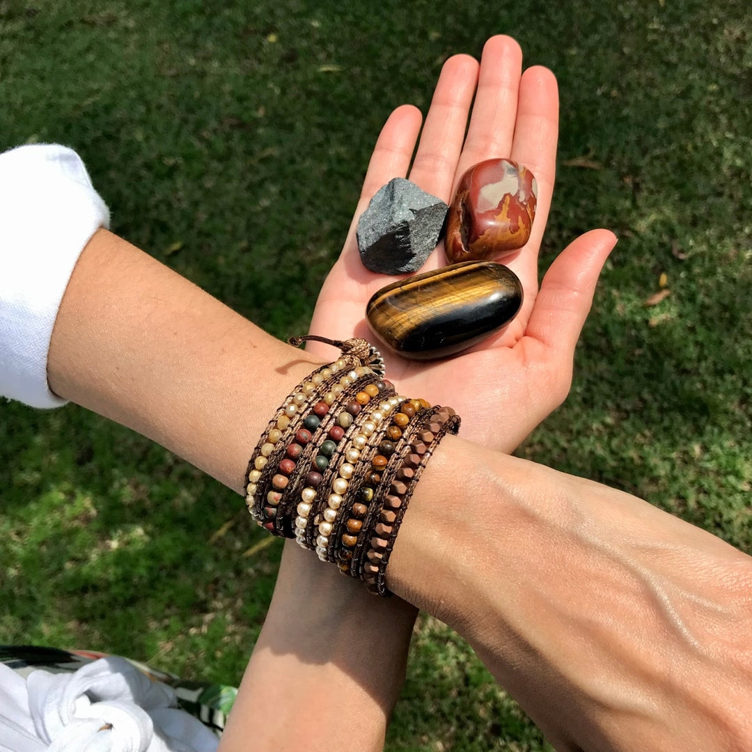 - Pedras naturais: Olho de Tigre, Jaspe Picasso e Hematita.