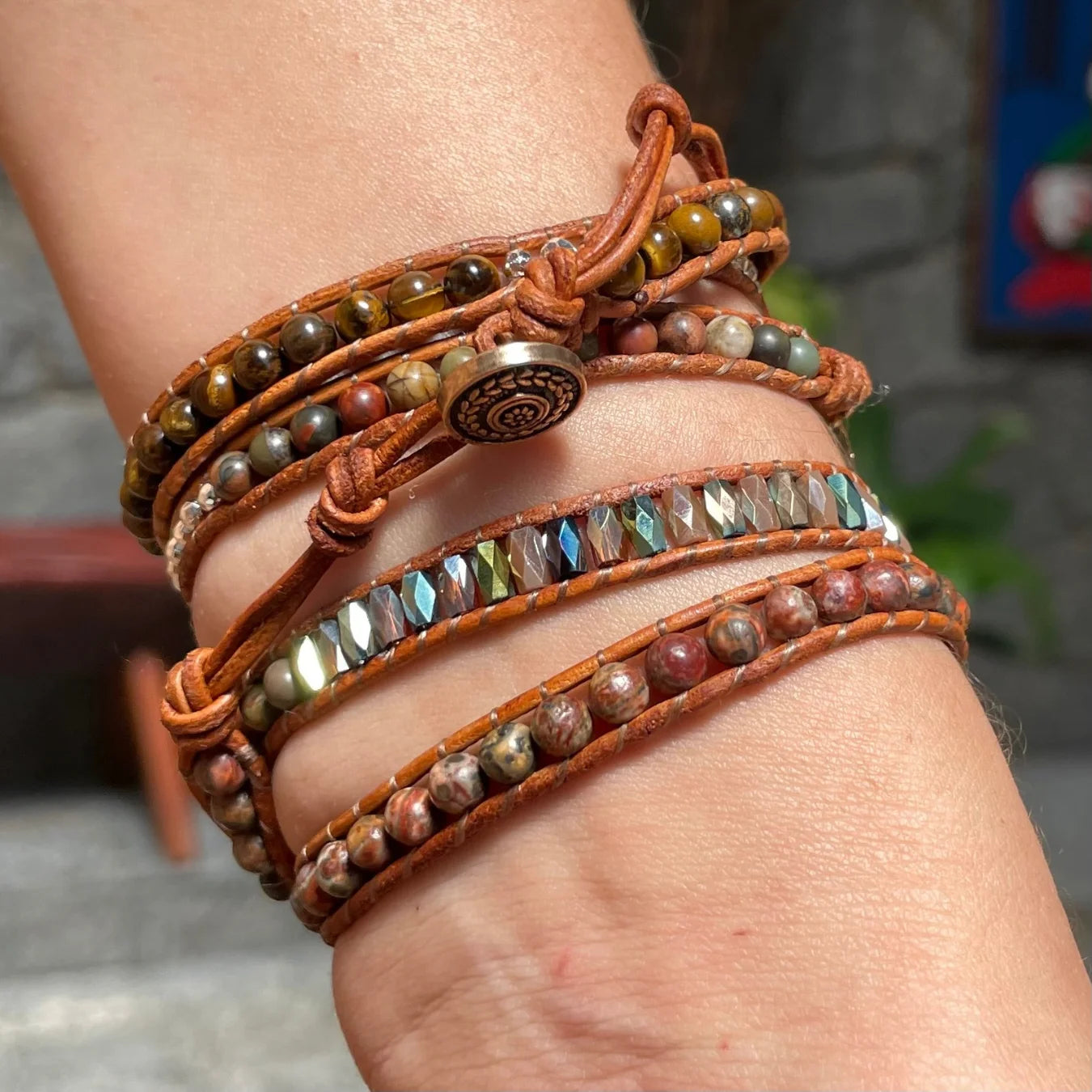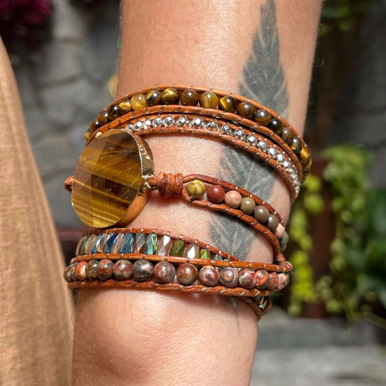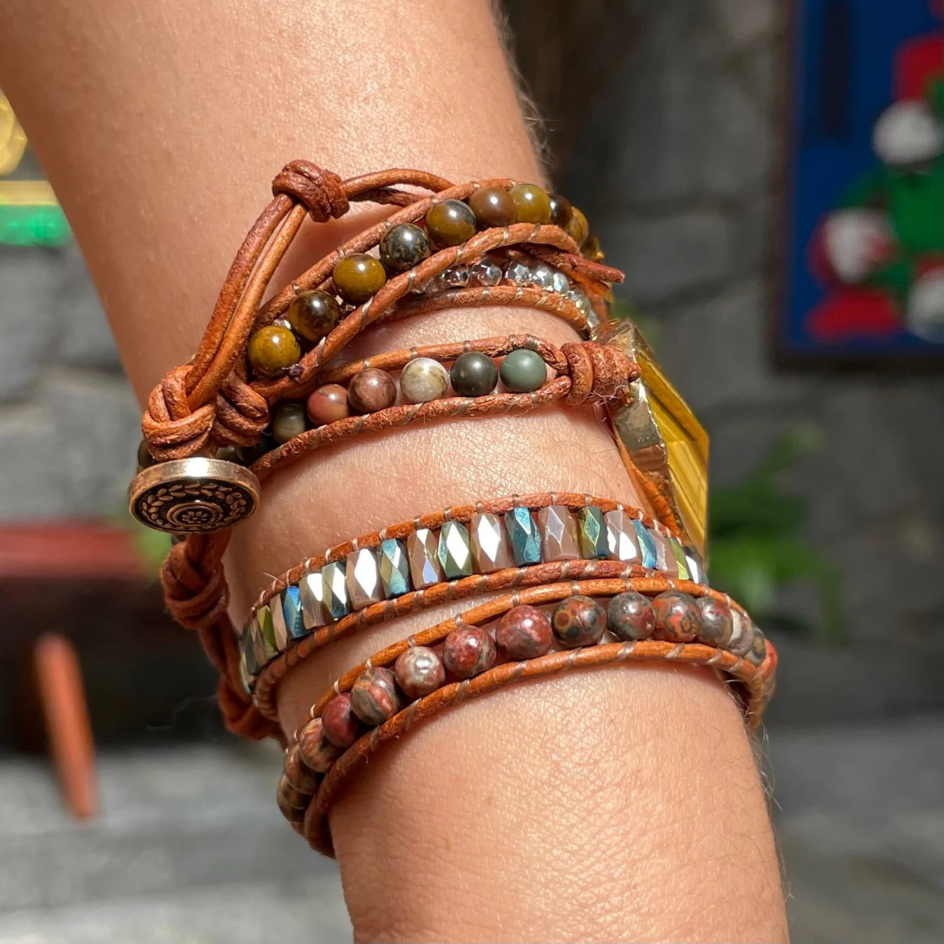 - Pedras naturais: Olho de Tigre, Jaspe Picasso e Hematita