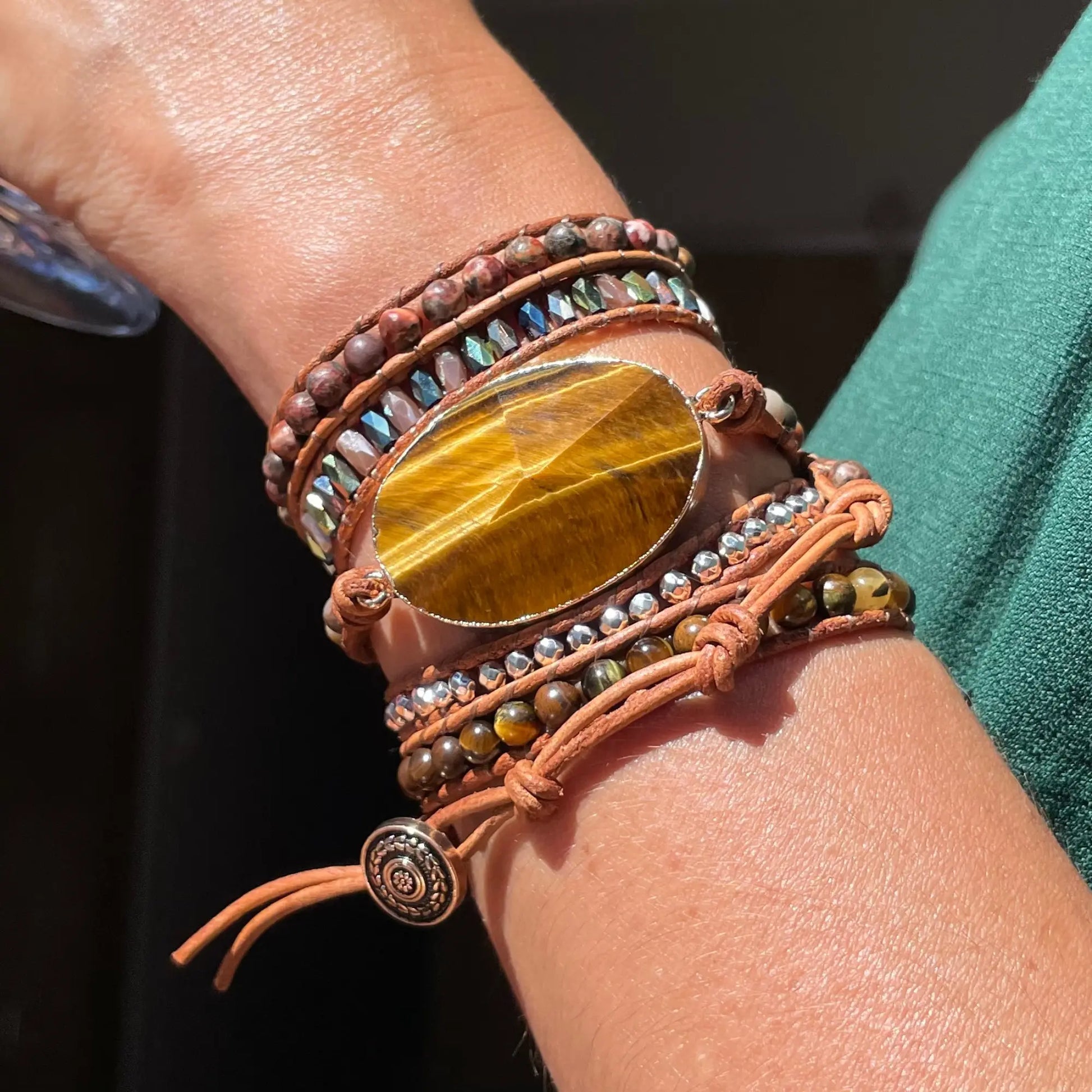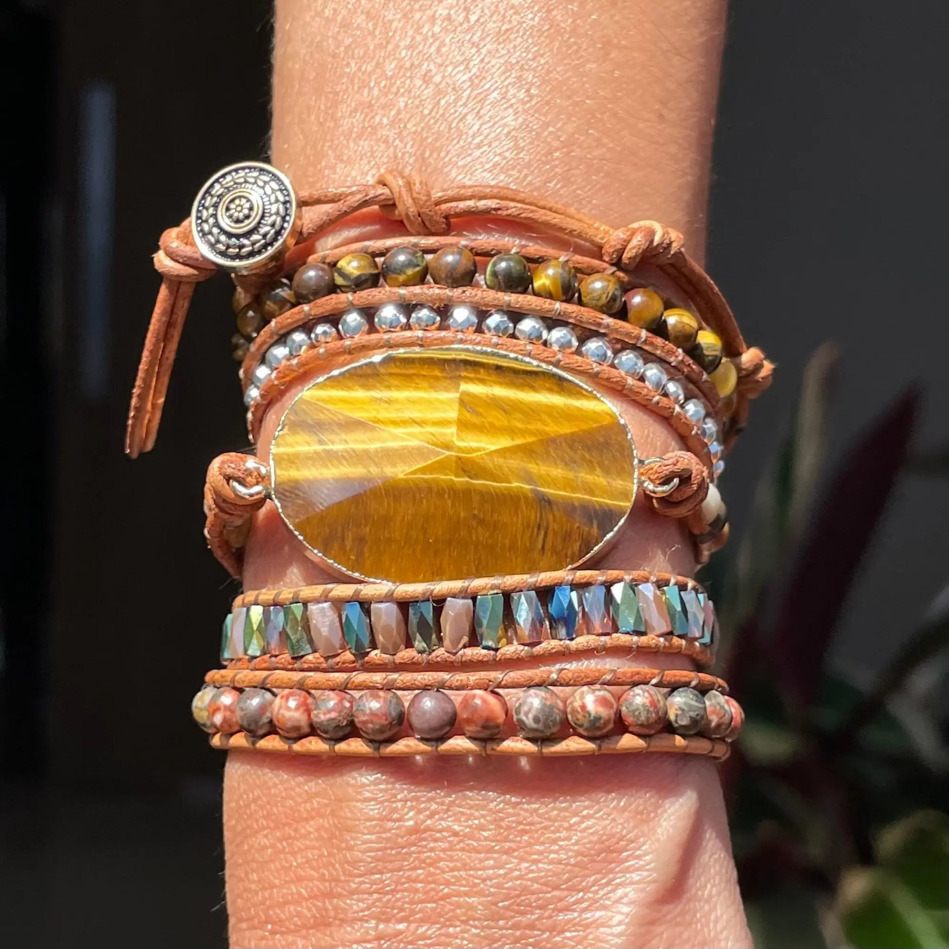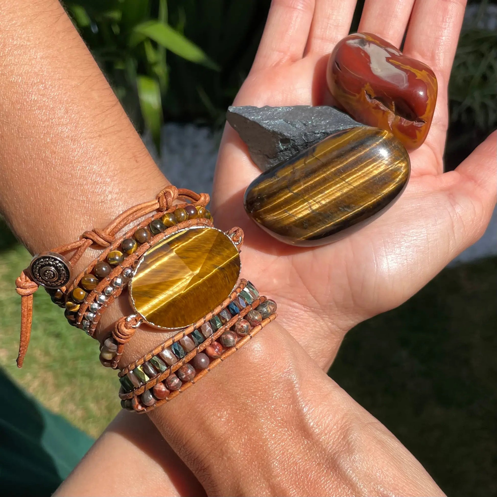 Olho de Tigre (pedra central): É uma pedra poderosa de clareza mental, capaz de elevar nosso intelecto e auxiliar o desenvolvimento de talentos pessoais. Além disso, é muito conhecido por aumentar a disposição e a vitalidade.